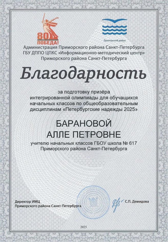 Грамоты, дипломы, сертификаты и благодарственные письма БАРАНОВОЙ АЛЛЫ ПЕТРОВНЫ