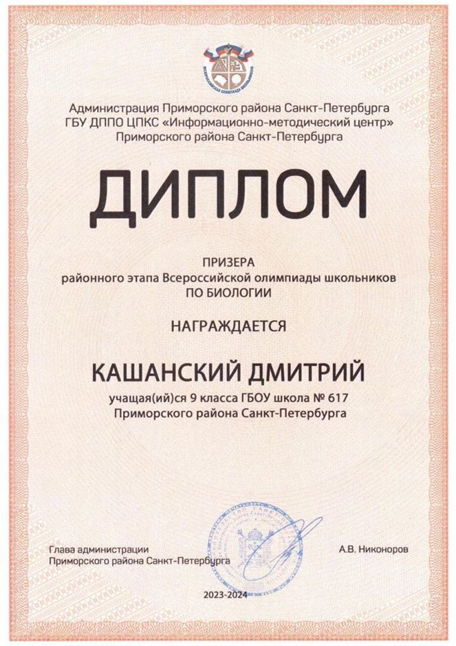 | 2023-2024 | биология | Кашанский Дмитрий | 9в | Садомова Е.Л. | призер |