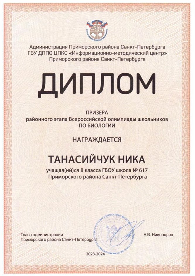 | 2020-2021 | биология | Петренко Мария | 8л | Зайцев Д.Н. | призер |