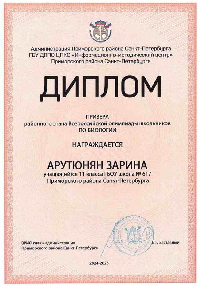 | 2024-2025 | биология | Арутюнян Зарина | 11м | Цымбал А.А. | Призёр |