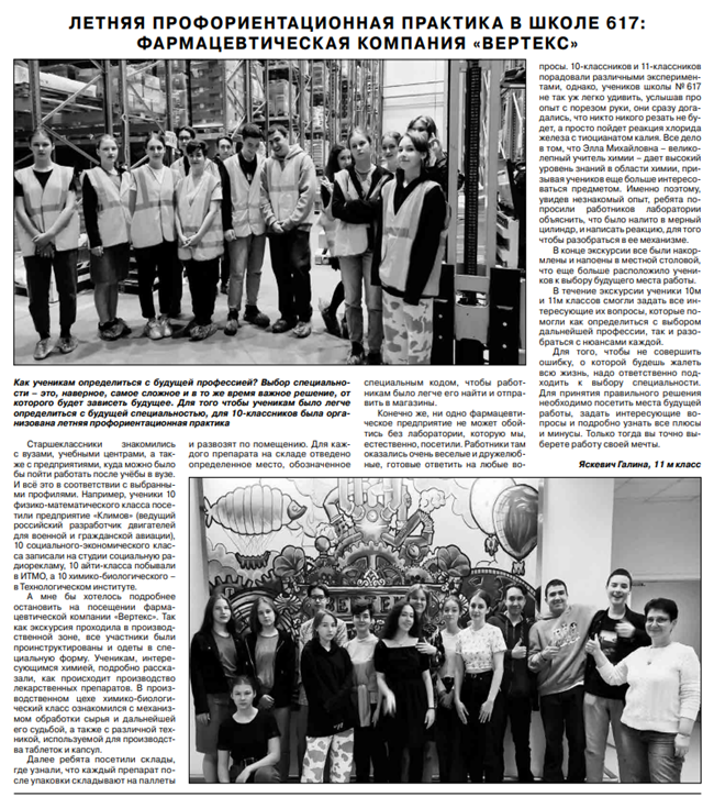 Летняя профориентационная практика в школе 617: фармацевтическая компания «Вертекс»