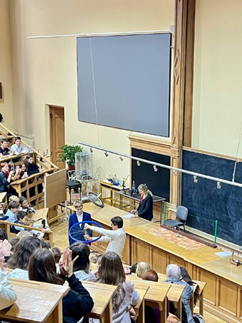 Ребятам посчастливилось не только побывать в Большой физической аудитории и ощутить атмосферу, размах самого большого лекционного зала Санкт-Петербурга, но и увидеть интересные физические опыты.