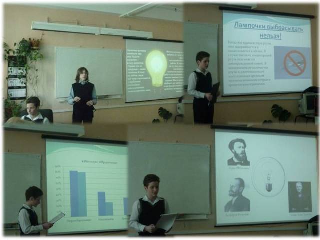 Во второй день на секции «На Земле и за ее пределами» свою работу "Да будет свет! Или все о лампочках" представляли Левдик Евгений и Разорёнов Фёдор (7л). В процессе работы над своим проектом они проводили и социологический опрос на тему актуальности поднятой проблемы, и проследили эволюцию развития лапм, и подняли проблему утилизации люминесцентных ламп в пределах школы, района и каждой семьи.