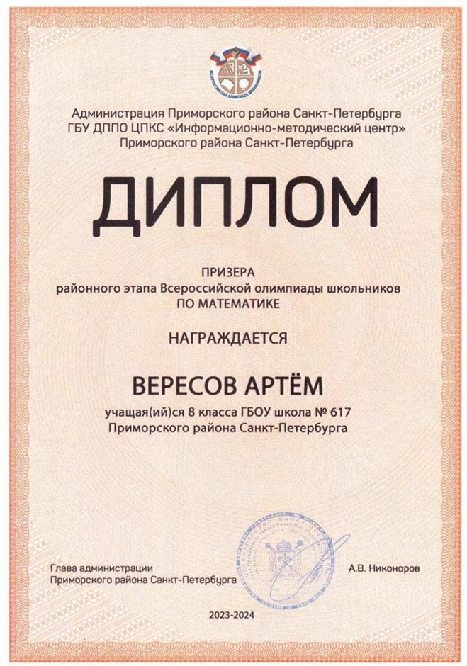 | 2024-2025 | математика | Белин Григорий | 6л1 | Вересов С.О. | Победитель |