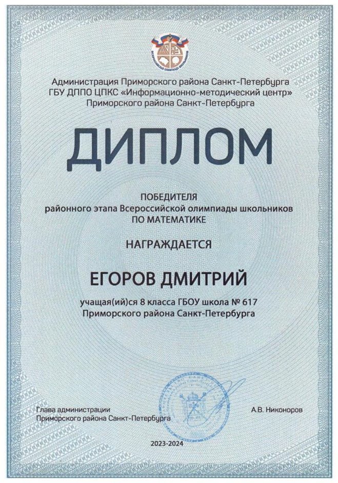 | 2023-2024 | математика | Егоров Дмитрий | 8л | Петрова Е.Н. | победитель |