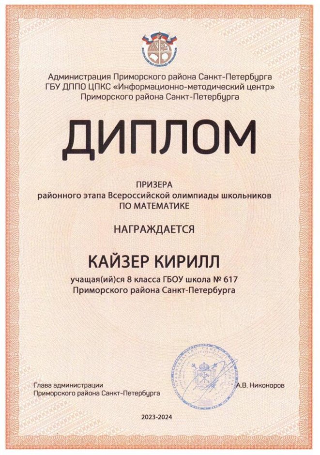 | 2023-2024 | математика | Кайзер Кирилл | 8л | Пыханова Н.С. | призер |