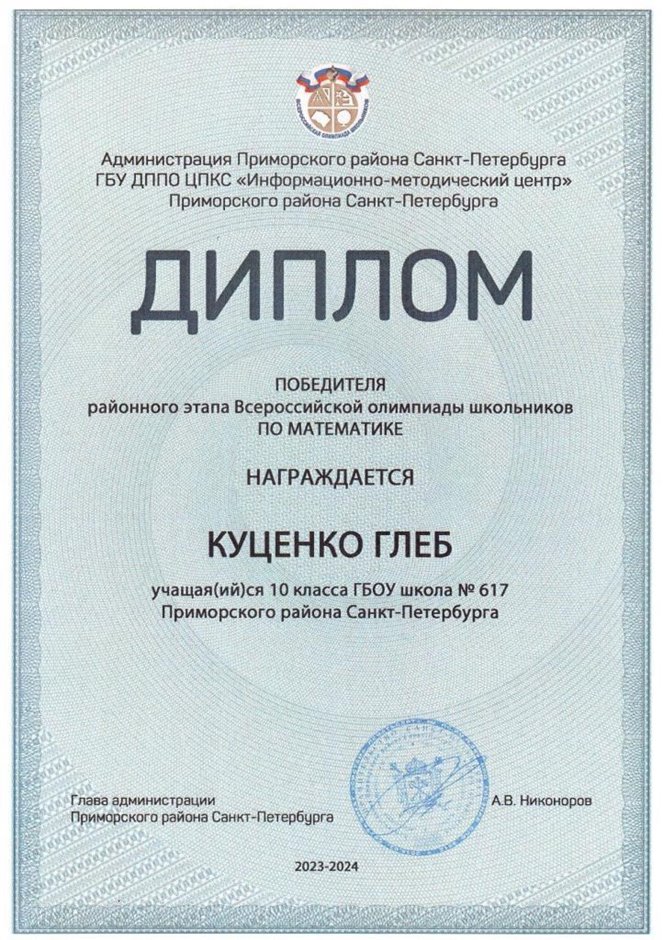 | 2023-2024 | математика | Куценко Глеб | 10л | Петрова Е.Н. | победитель |