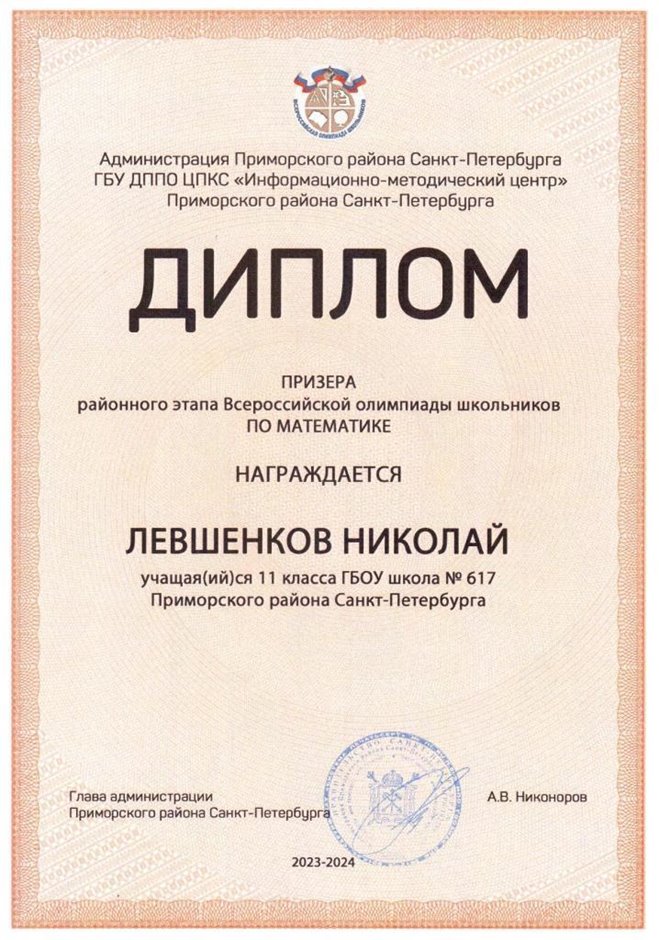 | 2023-2024 | математика | Левшенков Николай | 11и | Колпаков Р.Г. | призер |