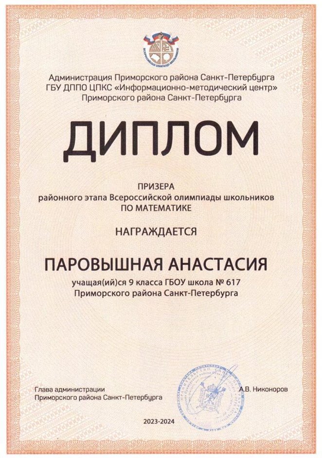 | 2023-2024 | математика | Паровышная Анастасия | 9л | Майконецкая Т.В. | призер |
