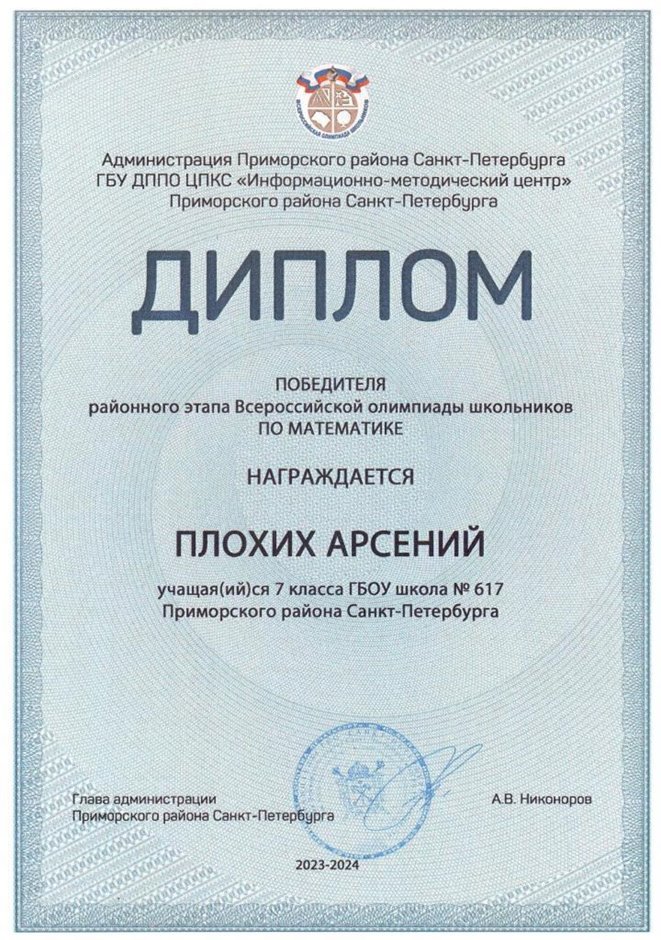 | 2023-2024 | математика | Плохих Арсений | 7л1 | Колпаков Р.Г. | похвальный отзыв |