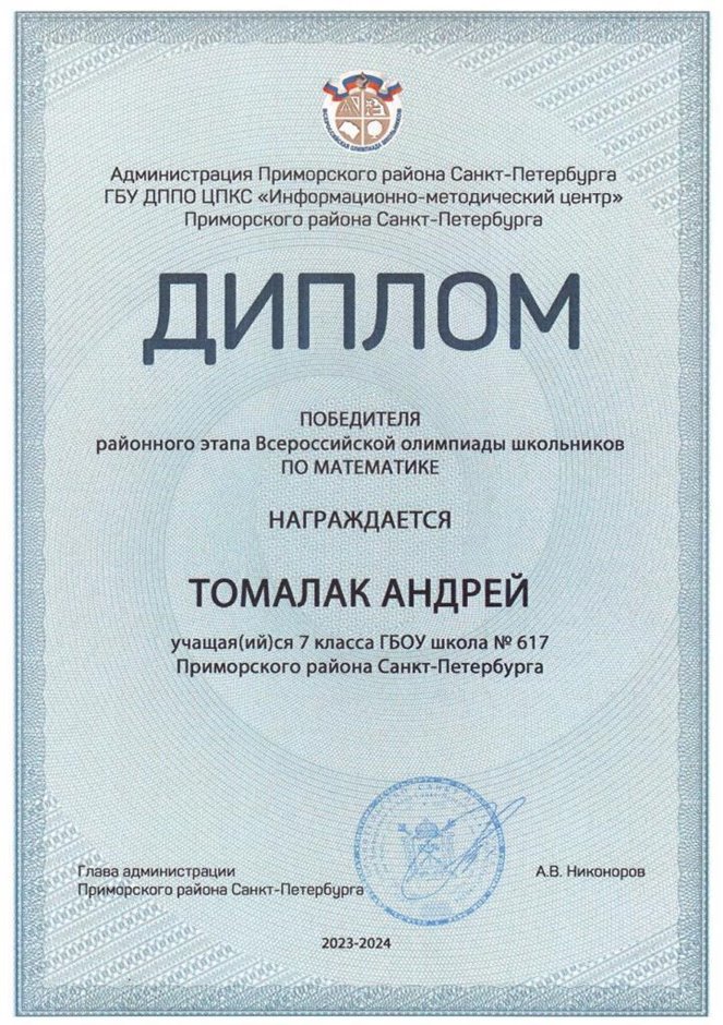 | 2023-2024 | математика | Томалак Андрей | 7л1 | Колпаков Р.Г. | победитель |