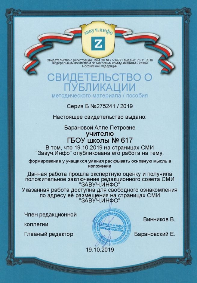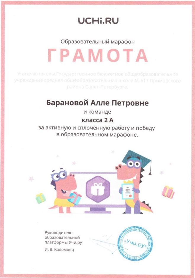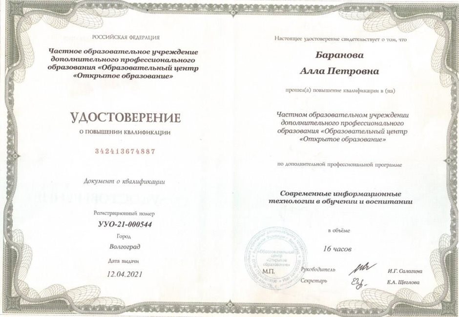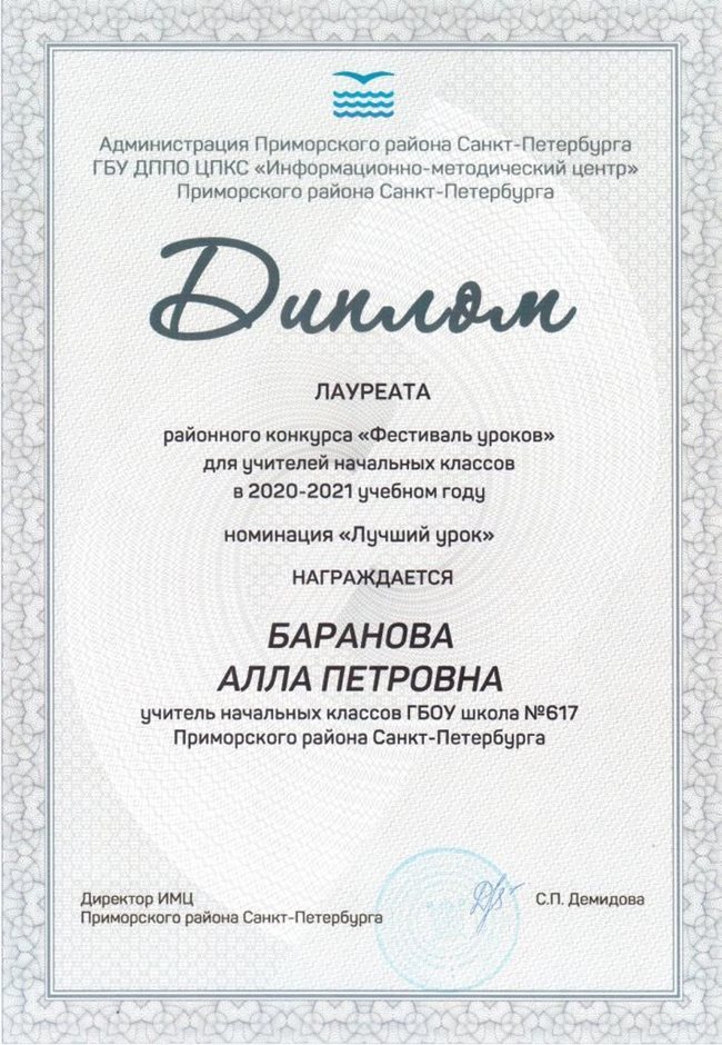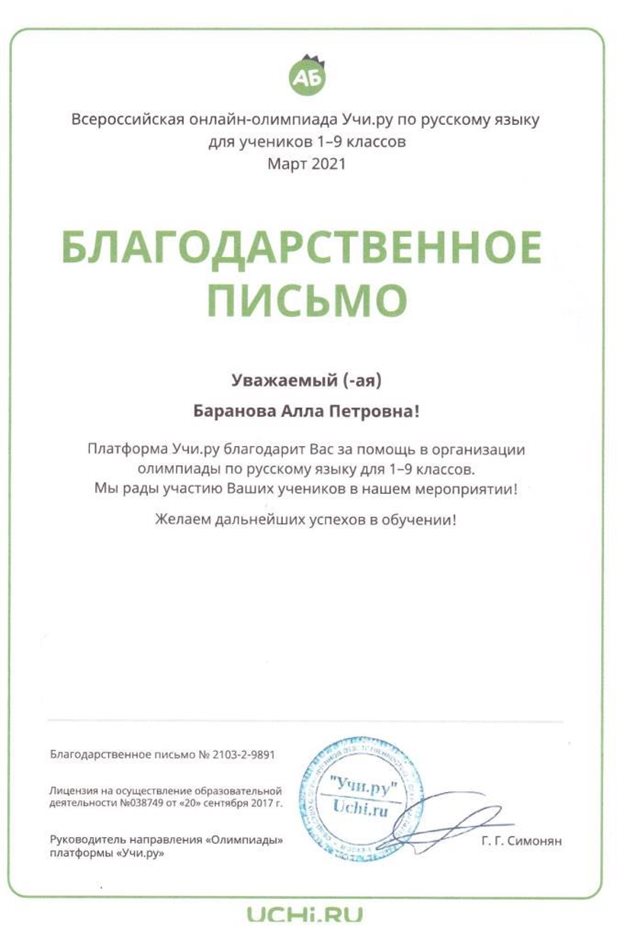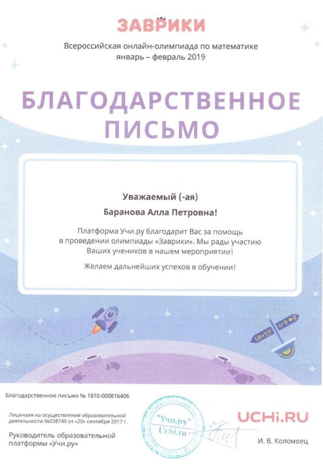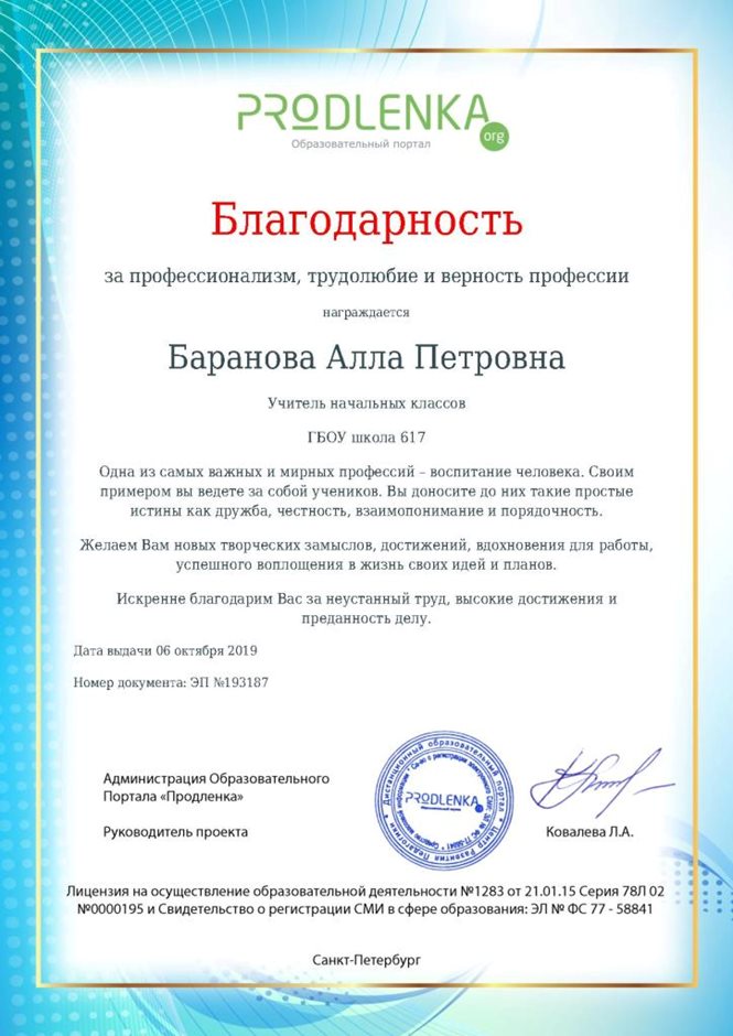 Грамоты, дипломы, сертификаты и благодарственные письма БАРАНОВОЙ АЛЛЫ ПЕТРОВНЫ