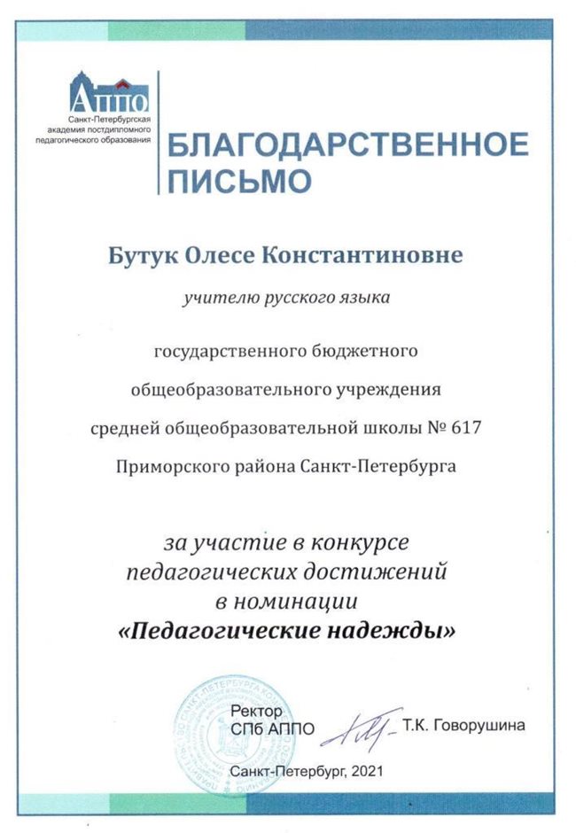 2020-2021 Бутук О.К. (Благодарственное письмо Педагогические надежды)