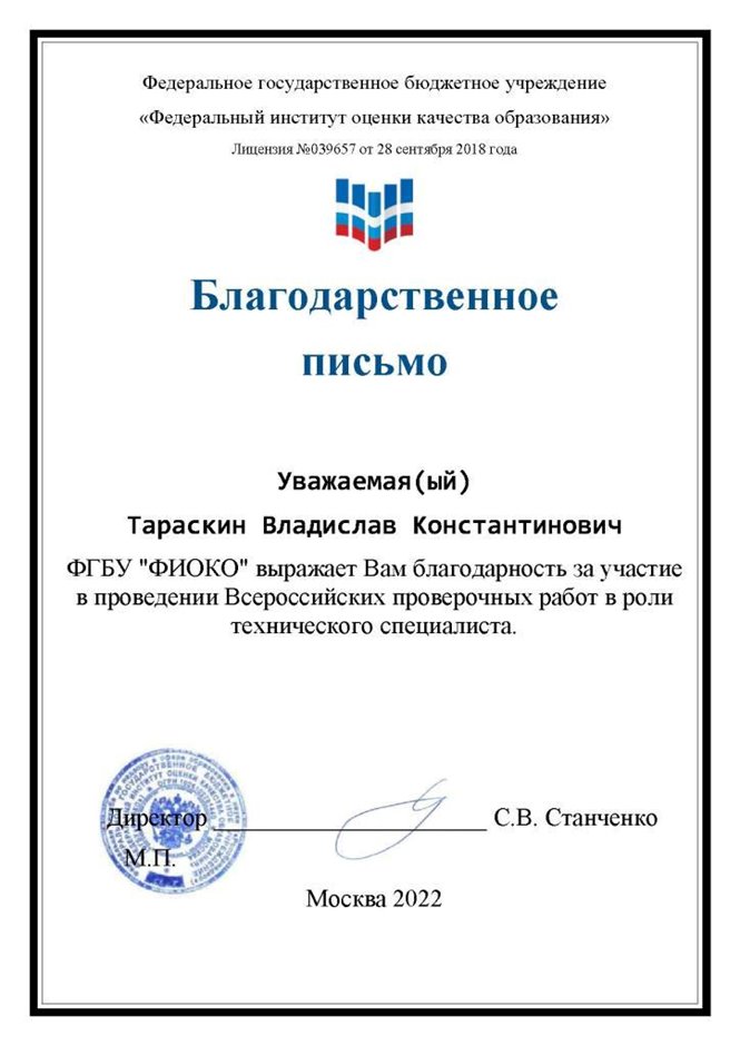2022-2023 Тараскин В.К. (Благодарственное письмо ВПР)