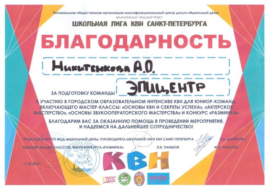2022-2023 Никитенкова А.О. (Благодарность школьная лига КВН)