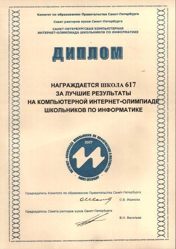 19 декабря 2007 года в Санкт-Петербургском государственном университете информационных технологий, механики и оптики состоялось торжественное вручение наград победителям городских Интернет-олимпиад по информатике. По рейтингу среди школ Санкт-Петербурга школа 617 вошла в двадцатку победителей. Наши учащиеся получили 12 дипломов. Школе вручили грамоту и подарок как одной из лучших школ города.