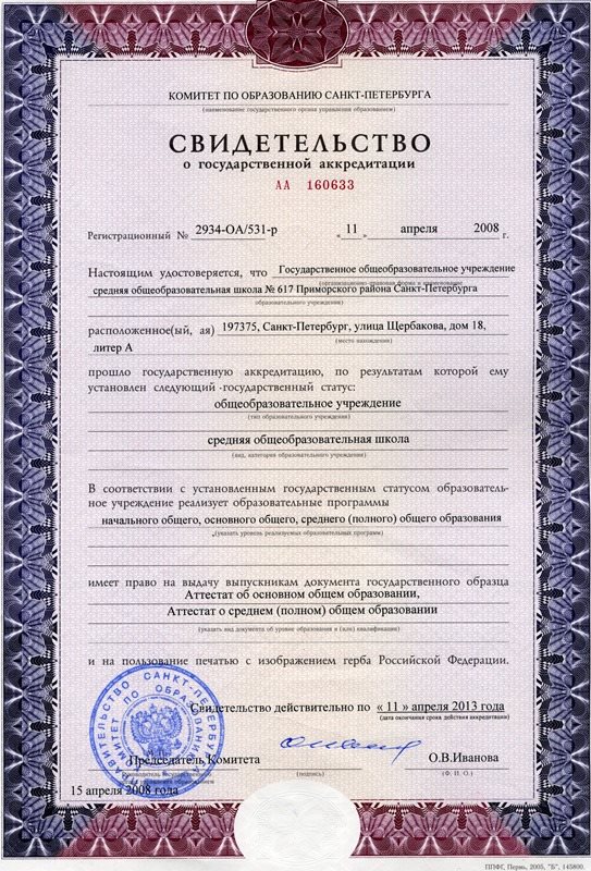 В 2007-2008 учебном году ГОУ школа № 617 проходила процедуру государственной аккредитации. Целями государственной аккредитации образовательного учреждения являются подтверждение соответствия качества образования по образовательным программам.