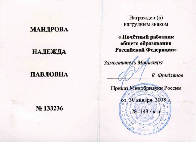 За заслуги в области образования Мандрова Надежда Павловна, учитель химии, награждена нагрудным знаком "Почетный работник общего образования Российской Федерации".