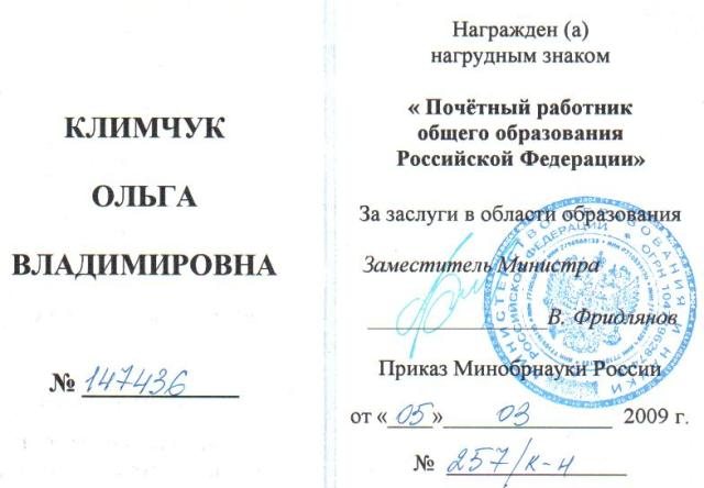 За заслуги в области образования Приказом Минобрнауки России Климчук Ольга Владимировна, учитель русского языка и литературы, награждена нагрудным знаком "Почетный работник общего образования Российской Федерации".