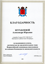 Журавлева Александра - призер заключительного этапа Всероссийской олимпиады школьников по ОБЖ.