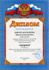 Лауреат конкурса педагогического мастерства учителей физической культуры Приморского района.