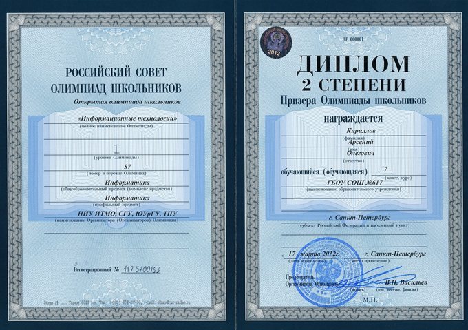 | Открытая олимпиада школьников "Информационные технологии" | Кириллов Арсений 7л | диплом 2 степени |