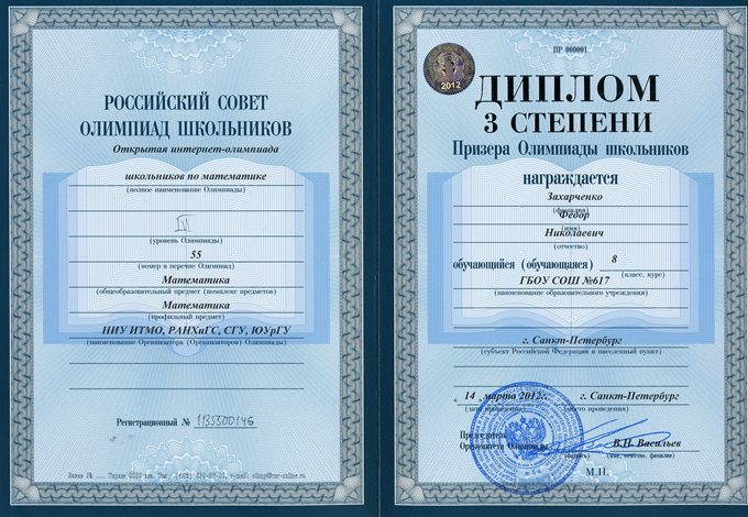 | Открытая олимпиада школьников по математике | Захарченко Федор 8л | диплом 3 степени |