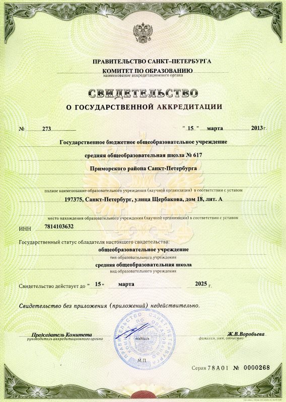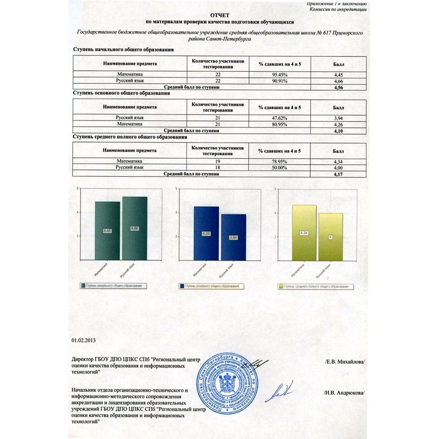 В 2012-2013 учебном году ГБОУ школа № 617 проходила процедуру государственной аккредитации. Целями государственной аккредитации образовательного учреждения являются подтверждение соответствия качества образования по образовательным программам.