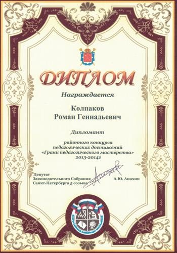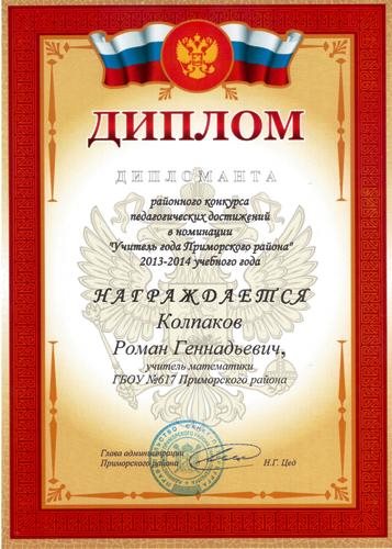 В номинации «Учитель года Приморского района» дипломантом конкурса стал Колпаков Роман Геннадьевич, учитель математики.