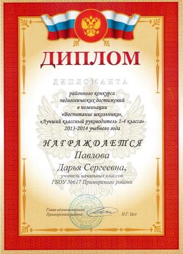 Учитель начальных классов Павлова Дарья Сергеевна стала дипломантом этого конкурса в номинации "Воспитание школьника", "Лучший классный руководитель 1-4 классов".