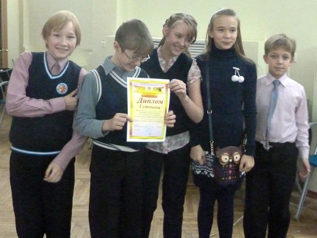 Команда пятиклассников нашей школы выиграла в районном конкурсе "Об удивительных и прекрасных". Районный брейн-ринг проходил в рамках проекта "Животные рядом с нами". Организатор конкурса - Молодежный творческий форум "Китеж плюс" В составе команды школы 617 были учащиеся: 5а - Якушева Виктория, 5б - Кочанов Георгий и 5л классов - Маляров Михаил, Мерзлякова Юлия и Полищук Сергей.