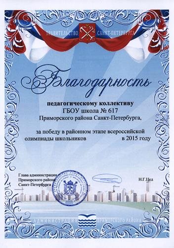 Школа № 617 в 2014/2015 вновь стала победителем в Приморском районе Санкт-Петербурга. По итогам районного этапа в рамках всероссийской олимпиады школьников учащиеся нашей школы награждены 90 дипломами победителей и призеров по 16 предметам.