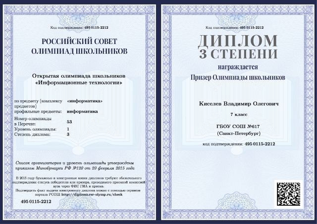 Ученики школы № 617 награждены дипломами по физике, математике, астрономии в олимпиадах 2014/2015 учебного года: