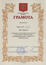 1 место в конкурсе литературно-музыкальных композиций "Герои России", посвященном памяти Героя СССР И.П. Васильева