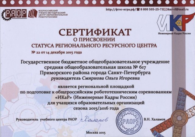 ГБОУ школа № 617 Приморского района Санкт-Петербурга получила статус региональной площадки по подготовке к общероссийским робототехническим соревнованиям "Инженерные кадры России" для учащихся образовательных организаций сезона 2015/2016 года.