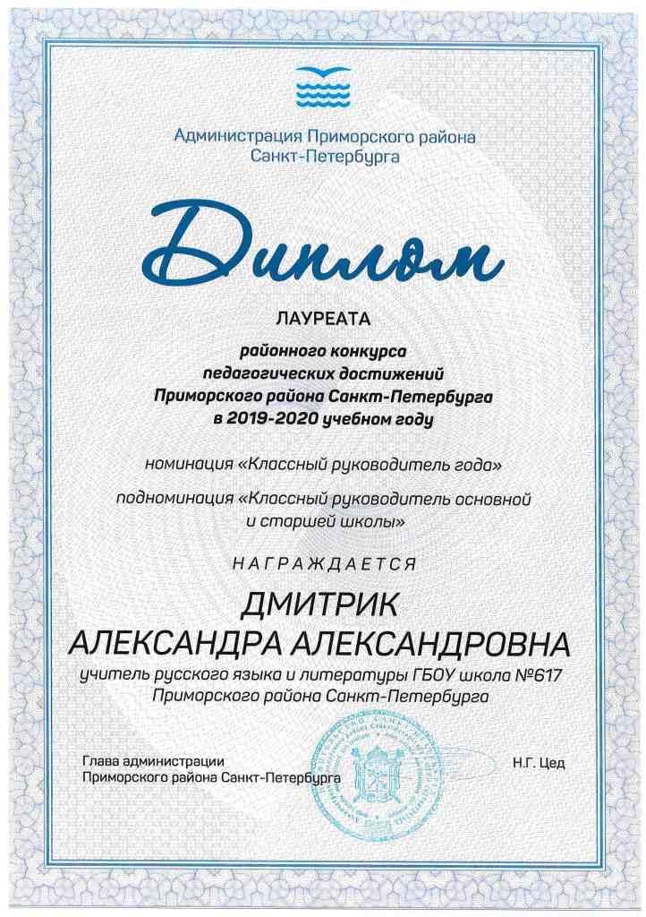 Дмитрик Александра Александровна, учитель русского языка и литературы ГБОУ школы № 617 Приморского района Санкт-Петербурга, стала лауреатом районного конкурса педагогических достижений Приморского района Санкт-Петербурга в 2019-2020 учебном году в номинации "Классный руководитель года", подноминация "Классный руководитель основной и старшей школы".