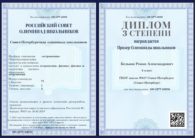 | 7 | Бельков Роман | 6л | Санкт-Петербургская олимпиада школьников | астрономия |