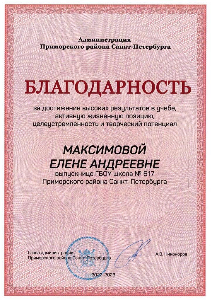 Выпускница 2023 года Максимова Елена – отличница. На ЕГЭ Елена получила 95 баллов по русскому языку, "5" по базовой математике, 100 баллов по химии и 89 баллов по биологии.