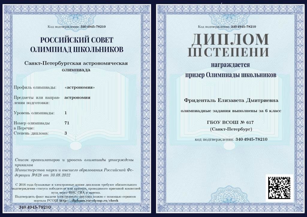 | 2022/23 | Фриденталь Елизавета | 6л1 | Санкт-Петербургская астрономическая олимпиада | Богданова И.В. | астрономия |