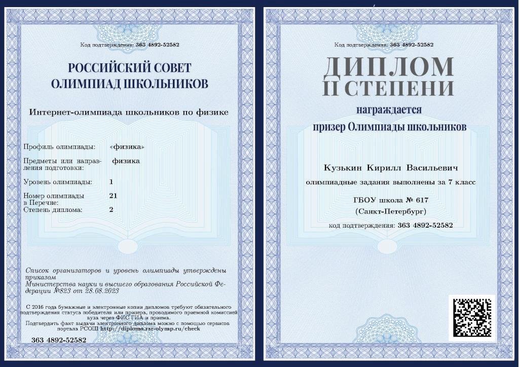 | Кузькин Кирилл | 7л1 | Интернет-олимпиада школьников по физике | физика |