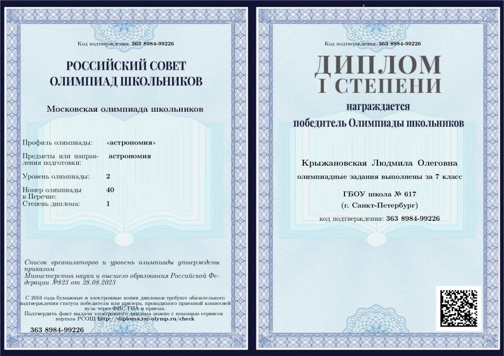 | Крыжановская Людмила | 7л1 | Московская олимпиада школьников | астрономия |