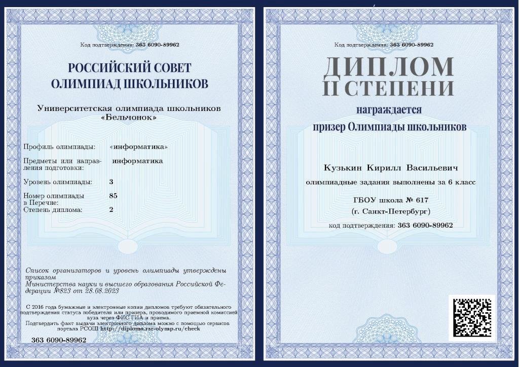 | Кузькин Кирилл | 7л1 | Университетская олимпиада школьников "Бельчонок" | информатика |