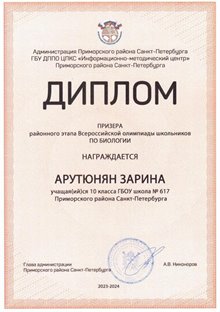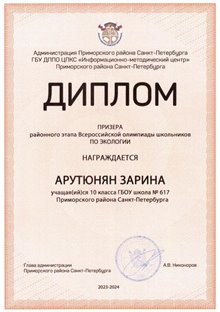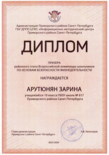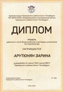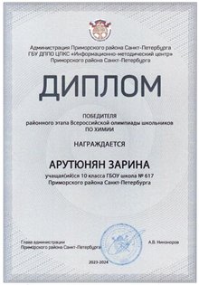 Также Зарина успешно участвовала во Всероссийской олимпиаде, имеет дипломы по Химии, ОБЖ, Биологии, Экологии, Технологии.