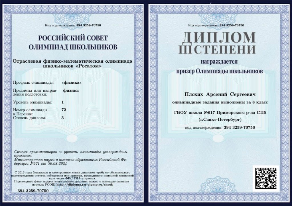 | Плохих Арсений | 8л1 | Отраслевая физ-мат олимпиада школьников «Росатом» | Федорчук Л.В. | физика |