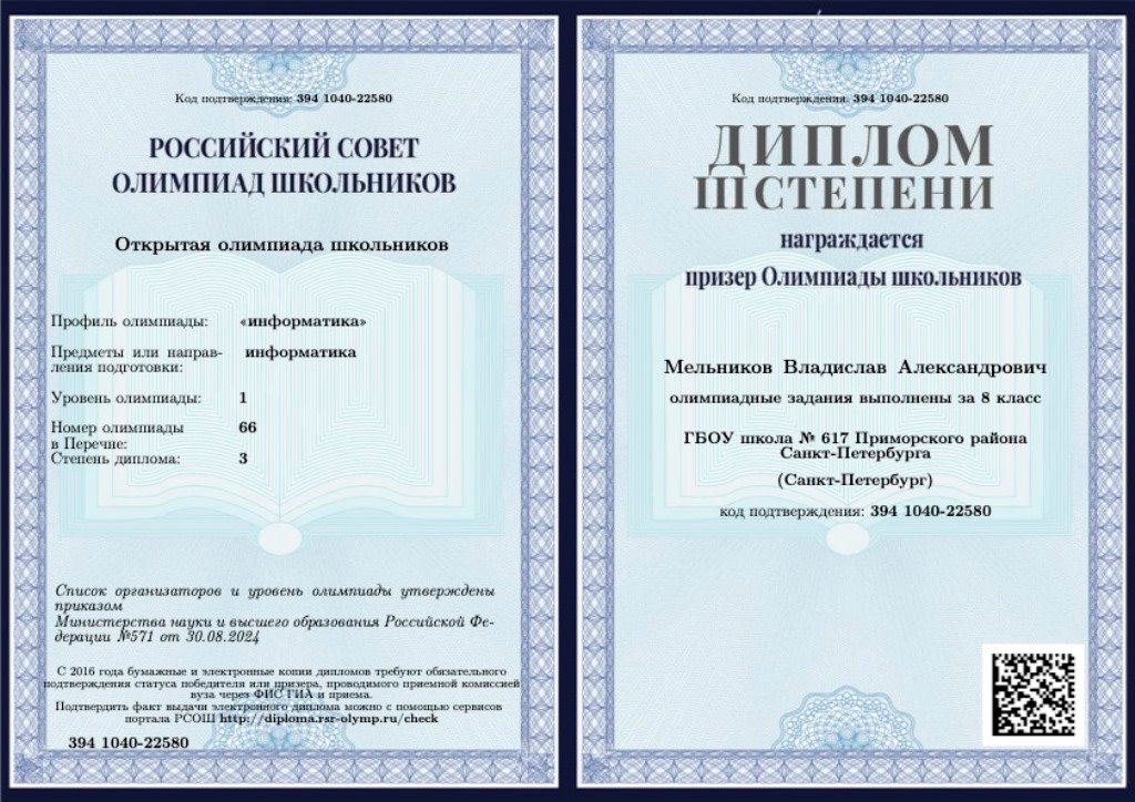 | Мельников Владислав | 8л1 | Открытая олимпиада школьников | Левшенкова Е.В. | информатика |