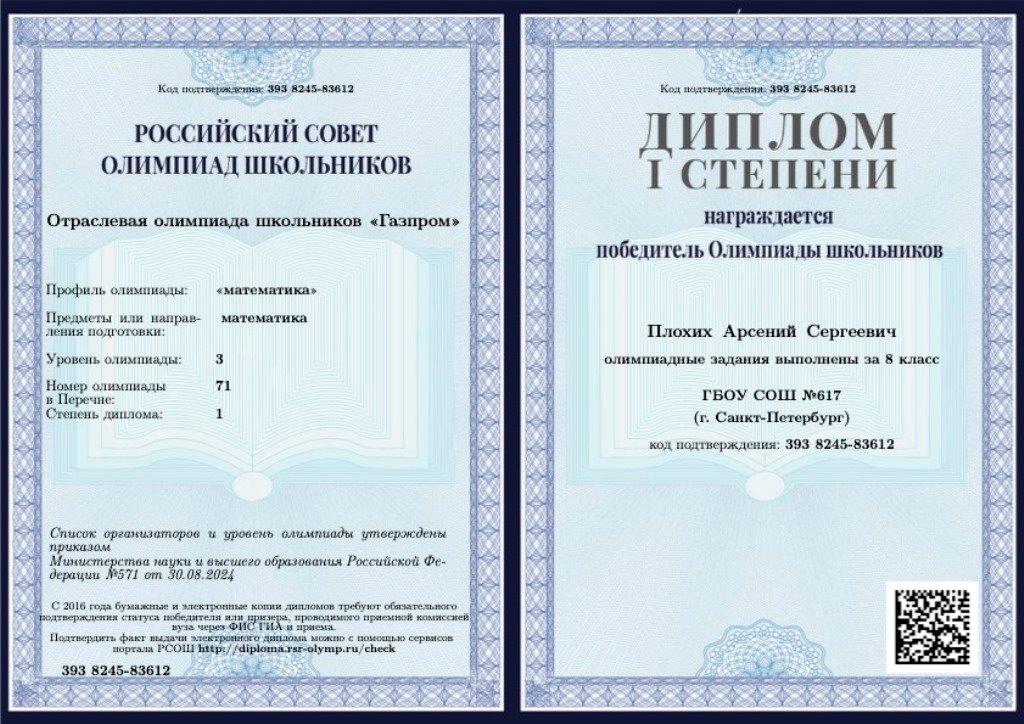 | Плохих Арсений | 8л1 | Отраслевая олимпиада школьников «Газпром» | Колпаков Р.Г. | математика |