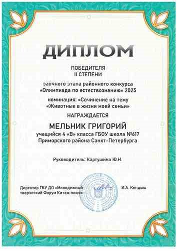 - Мельник Григорий, 4в класс - Диплом победителя 2 степени