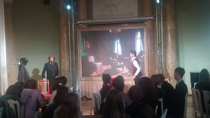 Это был квиз, состоящий из нескольких туров, где нужно было вспоминать произведения Гоголя, иллюстрации к ним, а также можно было блеснуть эрудицией, определяя, какие памятники посвящены Гоголю или его персонажам. А между турами игроков навещал самый настоящий Гоголь.