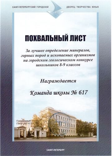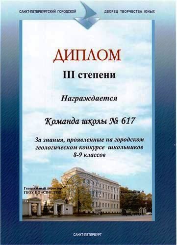 Городской конкурс по геологии проводится совместно с геологическим факультетом СПбГУ для учащихся 5-7 классов в два тура. Первый - заочный, до 20 декабря. Второй тур, очный, проходит во Дворце Творчества Юных в форме игры по станциям. Тематика станций: горные породы и минералы, геологические процессы, полезные ископаемые, доисторическая жизнь, камень в убранстве Санкт-Петербурга.