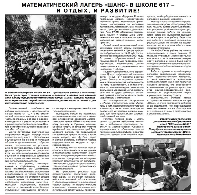 Математический лагерь "Шанс" в школе 617 - и отдых, и развитие